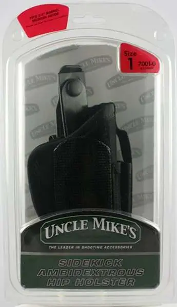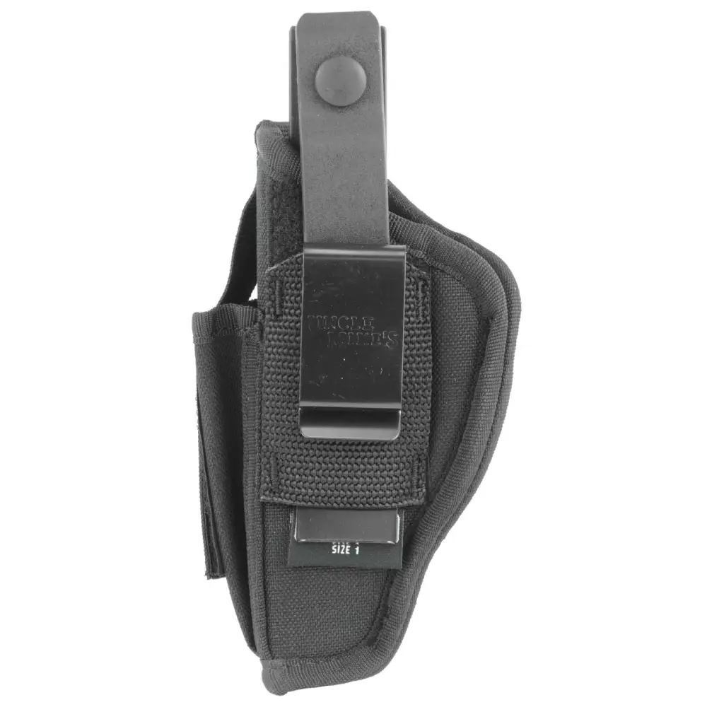 The Sidekick Hip Holster is a versatile holster with magazine pouch and removable belt clip. The velcro retaining strap secures magazine, yet provides easy access. It is constructed of tough, patented sidekick laminate of cordura nylon, waterproof closed cell foam padding and smooth nylon lining. The non-stretch retention strap and molded thumb break are anchored by one way velcro inside of the strap trap. Adjustment tool included.