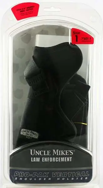The vertical carry provides excellent concealment, comfort and retention, especially with large guns. It has a cordura nylon outer shell, and a unique finger break over triggerguard. You can adjust the holster vertically on all four straps and also adjusts horizontally between yokes. Elastic onside and offside tie-downs are adjustable and removable. Also, the offside tie-down has single magazine case or single speedloader case for autos and revolvers respectively.