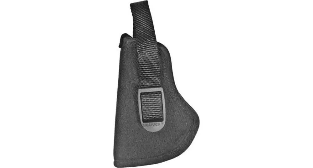 The patented Sidekick is made with the laminate of cordura nylon, waterproof closed cell foam padding, and smooth nylon lining. The memory quality of laminate molds to the gun for an excellent fit, yet returns to it's normal shape when the gun is removed. It also has the patented nylon web sight channel, medium high ride design, and the double-slotted molded belt loop lets you wear it on holster belt up to 2 1/4" wide or a standard trouser belt.