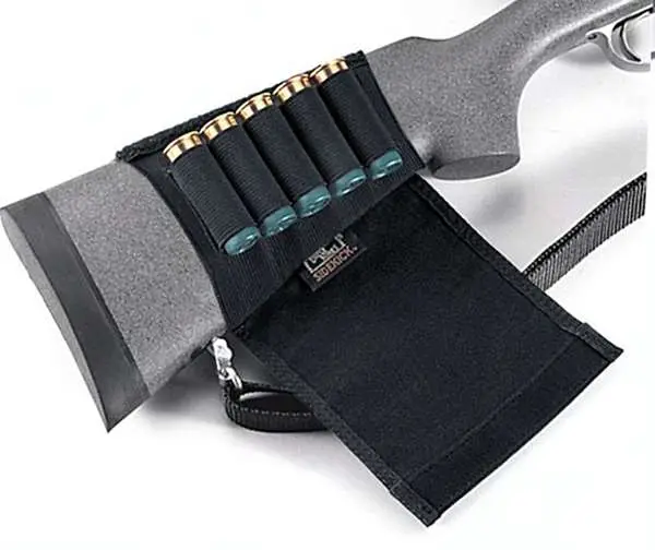 Shotgun buttstock shell holder hook-and-loop holds 5 shells. Made with Cordura nylon. Flap with hook-and-loop close folds up from bottom. Elastic sleeve slips over shotgun stock.