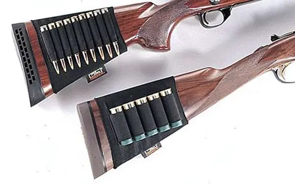 This shotgun buttstock shell holder holds 5 shells. The elastic sleeve slips over the shotgun stock, and it features sewn-on elastic loops. It comes in black.