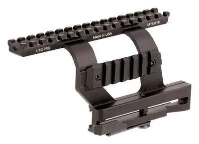 The UTG Pro Quick-detachable AK Side Mount fits most AK and Variants with side dovetail rail. Ergonomic lever with quick lock/release with full adjustability, U-cut on top for see-thru application with iron sights. Top rail with 16 slots for flexible optics applications and side rail with detachable 6-slot picatinny rail. Great zero holding and re-zoning capability. Made in the USA.