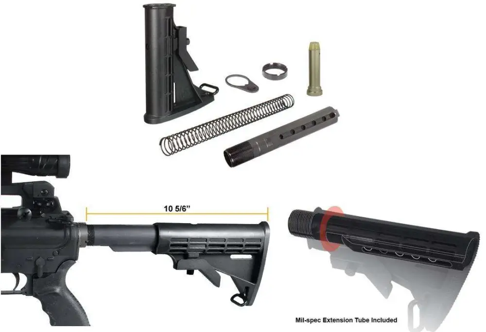 UTG PRO 6-Position Mil-spec Stock Assembly is built for heavy-duty operations with the tightest tolerance control. The polymer stock is made from impact resistant high-strength material, the mil-spec diameter extension tube is made from aircraft aluminum with rolled threads, FDE Cerakote applied for best corrosion and wear resistance. The stock assembly is complete with action spring, buffer assembly, tear-drop ring and castle nut. Proudly made in USA