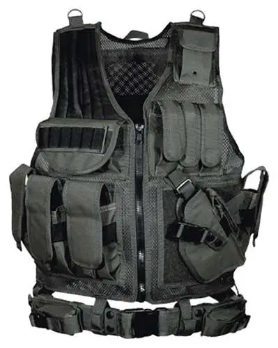 Leapers Tactical Vest has four deluxe adjustable rifle mag pouches, one deluxe universal cross-draw holster, heavy duty back loop system, and a durable rescue handle.