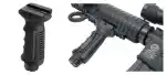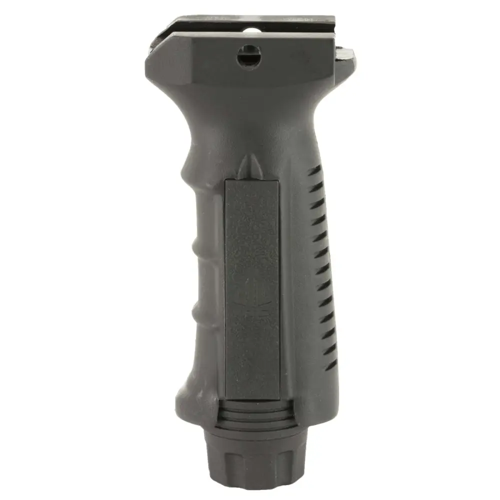 Leapers Inc UTG Vertical Foregrip has a Picatinny mounting deck, finger grooves, and an end cap for battery storage.