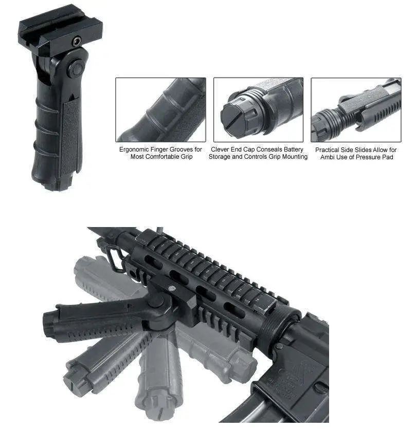 Leapers Inc UTG Foldable Adjustable Foregrip has a slide-on mounting deck, finger grooves, and an end cap for battery storage.