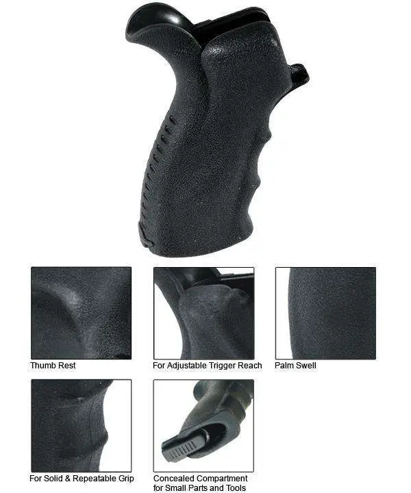 Leapers AR15 Pistol Grip has finger grooves, non-slip texture, and concealed storage for accessories.