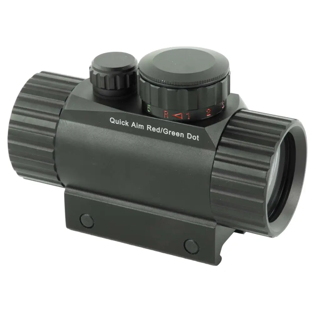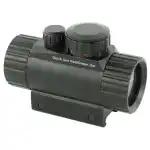 Leapers CQB Dot Sight is a quick aim electronic dot sight with red/green dual illumination. The 38mm tube comes with emerald lens coating for maximum brightness and clarity. This model includes an integral Picatinny mounting deck and flip-open lens caps.