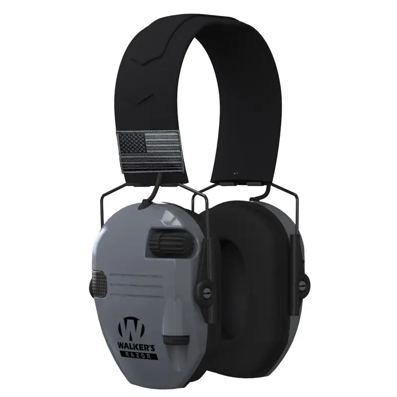 The Razor Electronic Patriot Muff Series has ultra low profile ear cups, two US Flag patches, and rubberized coating. It also has two Hi-Gain Omnidirectional microphones, audio input jack, and a low noise/frequency tuned for natural sound clarity. This Sports South Exclusive model features a 23 dB rating and a gray finish.