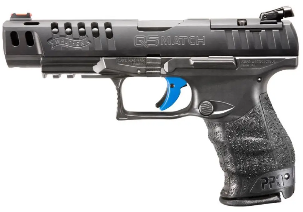 The Q5 Match from Walther is built for the production class competitive shooter. Built around Walther's award winning PPQ platform, the Q5 Match features an optics ready slide that comes with a Trijicon RMR, Leupold Delta Point, and Docter Optics ready mounting plate in addition to the standard competition iron sights already included. Coupled with a ported slide, Carl Walther signature ergonomics, and a blue quick defense trigger, the Q5 is the firearm that gives you match performance in a production class firearm.