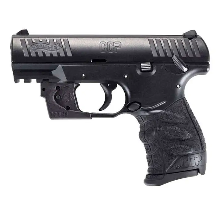 Walther's CCP is an ideal combination of style, ergonomics, size, shape, accuracy, and ability to conceal comfortably. It features a Softcoil gas-delayed blowback system which uses gas pressure from the ignited cartridge by directing it through a small port in the barrel in front of the chamber to slow down and delay the rearward motion of the slide. The CCP utilizes a polymer frame with accessory rail, manual thumb safety, low-profile 3-Dot sights, and non-slip grip. The slide features a slide stop lever and front/rear serrtions. This M2 model has a 3.54" barrel and black cerakote finish. It features a Viridian red laser.