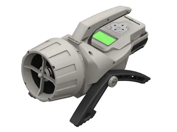 The Mantis Pro 100 is a pre-loaded game call featuring a durable ABS construction, swiveling legs, 4" reflex loudspeaker (loudness 105 to 110db) and 32MB internal memory- that stores 100 permanent sounds. External power jack with mounting bracket for motorized decoy (removable cover to expose mount and connector). Integrated/removable remote control, all functions are controlled thru remote, remote control with backlit screen with 4 to 6 lines of text/icons- up to 300 yards for remote control. Calls included wolf, elk, deer, hog, turkey, bobcat, coyote, moose, rabbit, duck, fox and many more. Operates on 8 AA batteries (not included).