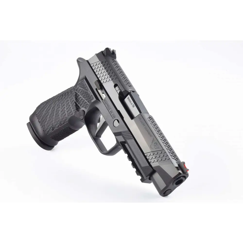 Wilson Combat and SIG SAUER are pleased to announce the availability of a Wilson Combat enhanced P320 9mm semi-automatic pistol collaboration, the WCP320. Using the Wilson Combat SIG P320 grip module, our in-house re-machined slide and Wilson Combat performance battlesights, the Wilson Combat Optimized WCP320 is tailored for precision tactical pistol shooting. Featuring the Wilson Combat polymer grip module; the slide has been machined with the Wilson Combat X-TAC pattern for improved manipulation under stress. The front and rear cocking serrations, as well as the slide top, wear this signature Wilson Combat pattern with the Wilson Combat logo on the slide. The stainless steel slide and chromoly barrel wear the most advanced black DLC (Diamond-Like-Carbon) physical vapor deposition finish; The SIG SAUER flat-faced XFULL trigger is standard on the WCP320 and gives shooters a lower finger position on the trigger which increases leverage for a lighter, smoother trigger pull and Wilson Combat Battlesight with red fiber optic front sight. Includes two 17rd X-Series magazines.