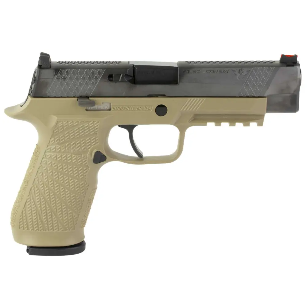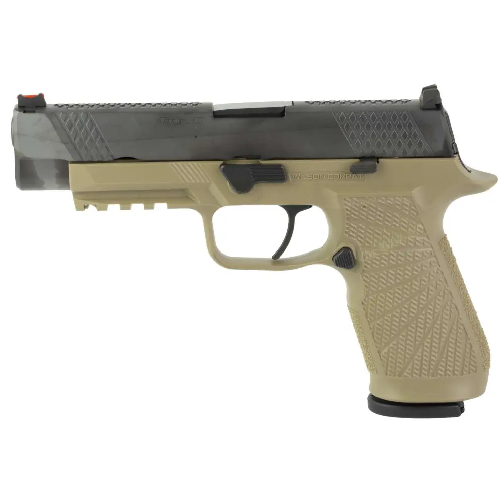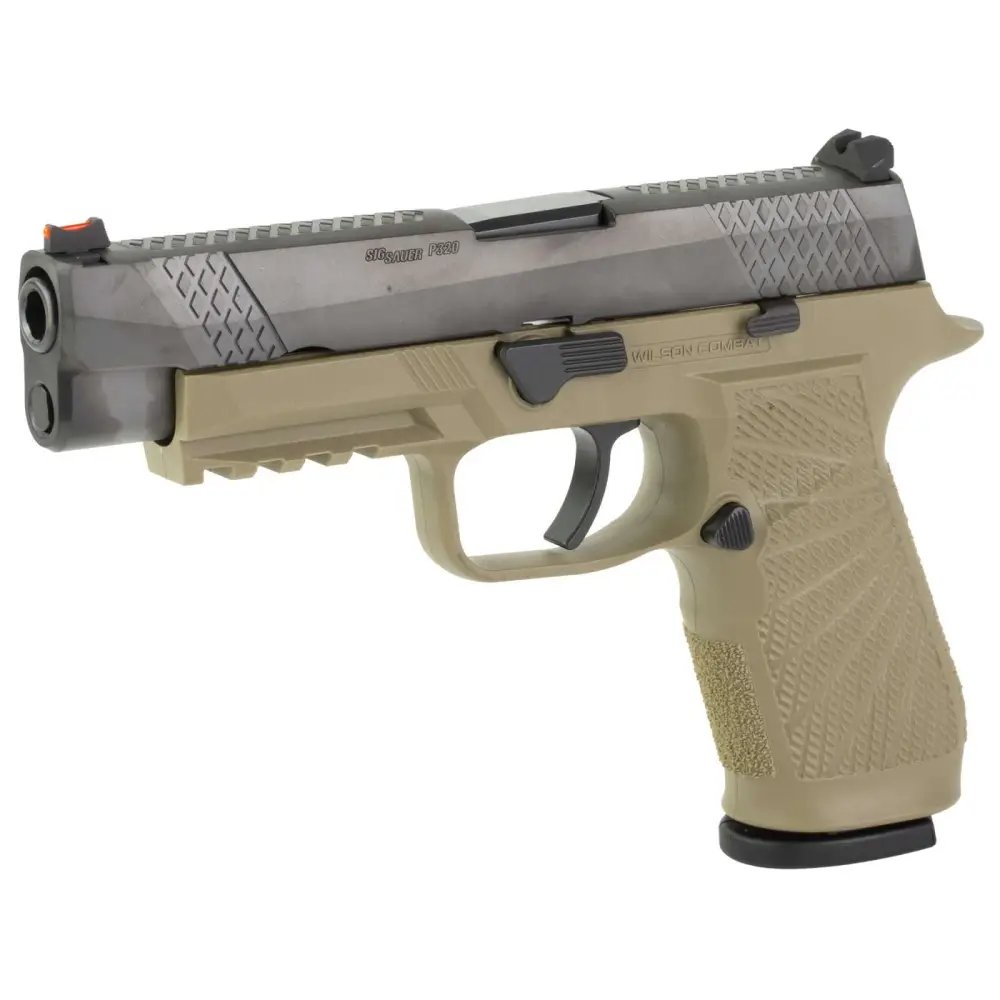 Wilson Combat and SIG SAUER are pleased to announce the availability of a Wilson Combat enhanced P320 9mm semi-automatic pistol collaboration, the WCP320. Using the Wilson Combat SIG P320 grip module, our in-house re-machined slide and Wilson Combat performance battlesights, the Wilson Combat Optimized WCP320 is tailored for precision tactical pistol shooting. Featuring the Wilson Combat polymer grip module; the slide has been machined with the Wilson Combat X-TAC pattern for improved manipulation under stress. The front and rear cocking serrations, as well as the slide top, wear this signature Wilson Combat pattern with the Wilson Combat logo on the slide. The stainless steel slide and chromoly barrel wear the most advanced black DLC (Diamond-Like-Carbon) physical vapor deposition finish; The SIG SAUER flat-faced XFULL trigger is standard on the WCP320 and gives shooters a lower finger position on the trigger which increases leverage for a lighter, smoother trigger pull; action tune with curved trigger and Wilson Combat Battlesight with red fiber optic front sight. Includes two 17rd X-Series magazines.