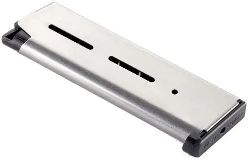 Wilson Combat's 1911 Magazine, .45 ACP, Full-Size (Government Model), 8 Round Capacity, Lo-Profile steel base Pad springs are specially fabricated from the highest tensile strength heavy duty spring for long service life, enhanced feeding and positive slide stop operation. It is manufactured from aircraft grade certified stainless steel, and heat treated for maximum durability and service life.
