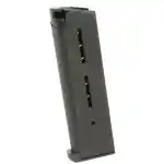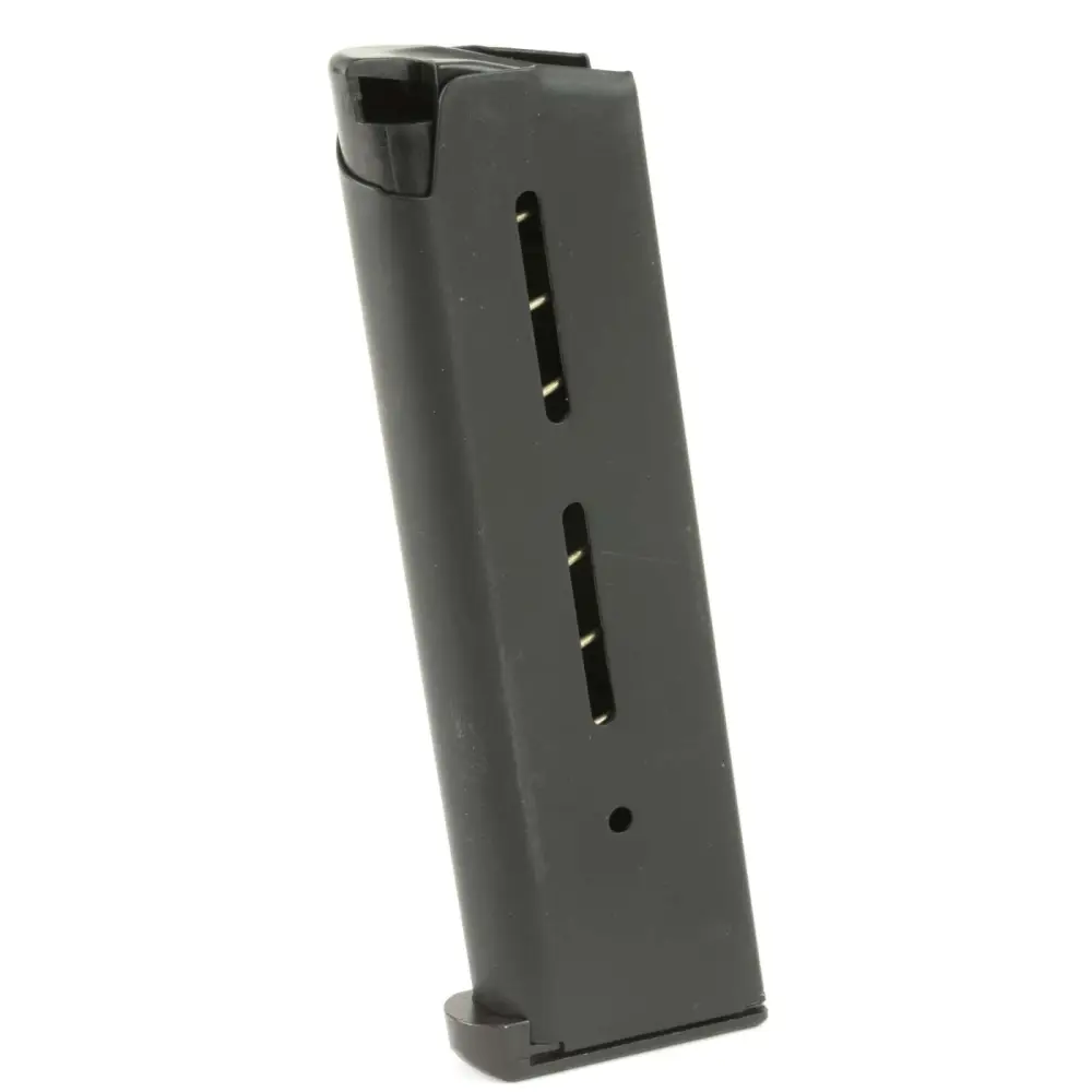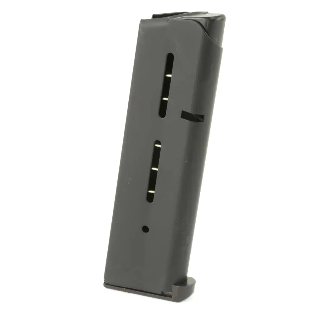 Wilson Combat's 1911 magazine has proven inherent reliability, durability and the ability to remain fully loaded for long periods of time without damage. The magazine springs are specially fabricated from the highest tensile strength heavy duty spring for long service life, enhanced feeding and positive slide stop operation. It is manufactured from aircraft grade certified stainless steel, and heat treated for maximum durability and service life. This model has a black finish and a low-profile steel base pad.