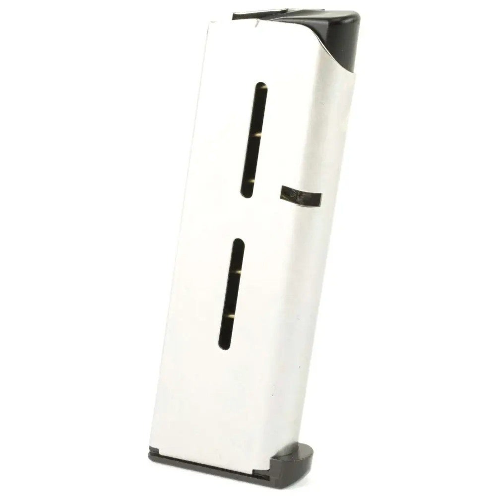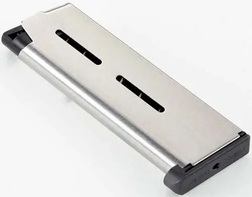 Wilson Combat's 1911 Magazine, .45 ACP, Compact, 8 Round, Lo-Profile OM Steel Base Pad springs are specially fabricated from the highest tensile strength heavy duty spring for long service life, enhanced feeding and positive slide stop operation. It is manufactured from aircraft grade certified stainless steel and heat treated for maximum durability and service life. This model is compatible with 1911 Compact, Officer's model.