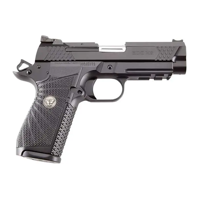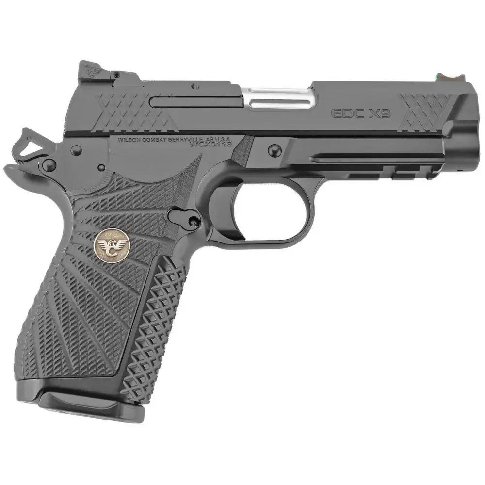 Wilson Combat's EDC X9 is an everyday carry, 1911 with match-grade accuracy, superior ergonomics, and concealability with modern service pistol capacity and reliability. It is a hybrid of Wilson's EDC 9 1911 slide assembly with a high-capacity X-frame. The slide assembly features ERS "Enhanced Reliability System". The ERS is tailored to the varying power level of 9mm ammunition and maintains impressive reliability in all conditions. Other features include a Tri-Top slide profile with user-replaceable front sight, rear tactical adjustable battlesight, single lug tapered cone match-grade barrel, and a rugged, user-serviceable external extractor. The screwless, X-frame is machined from T6-7075 aluminum and accepts a high capacity magazine with a grip that is smaller in circumference than a standard 1911 while retaining traditional 1911 controls. It uses hammer spring tension to keep the aggressive traction Wilson/VZ G-10 starburst pattern grips securely in place. The X-frame also features a small backstrap and medium trigger pad. The front and back strap are machined with the Wilson Combat X-Tac tread pattern which provides a tactile but nonabrasive grip. Included are two 15-round magazines. This model has an accessory rail.