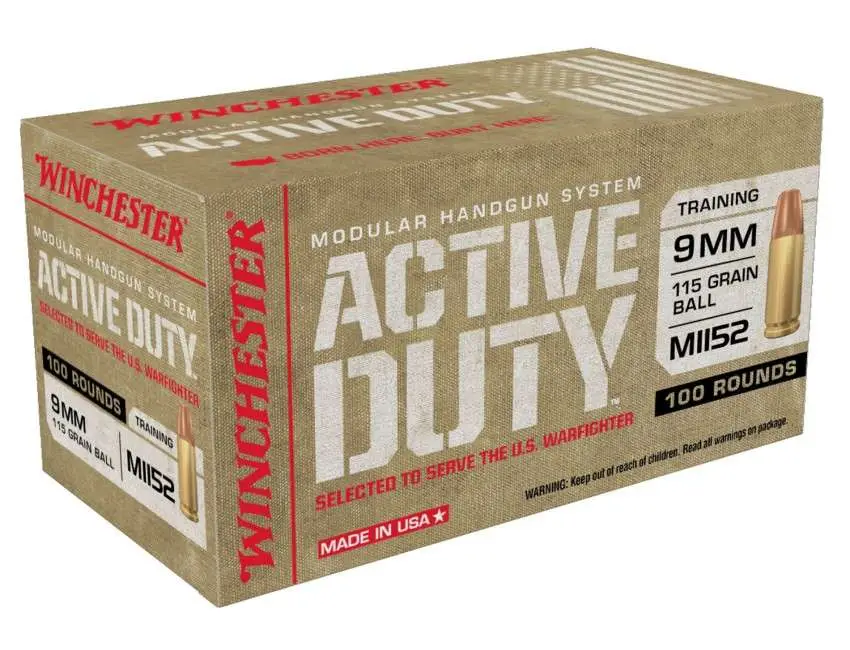 Winchester Ammo WIN9MHSC Active Duty 9mm Luger 115 gr Full Metal Jacket Flat Nose (FMJFN) 100 Bx/ 5 Cs
