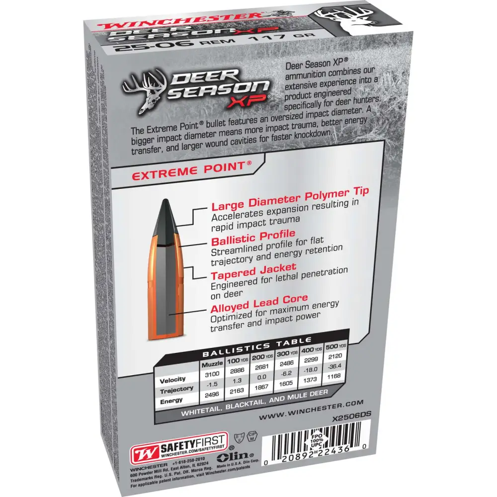 Deer Season XP combines decades of Winchester experience into the perfect choice for deer hunting ammunition. It is built specifically for deer hunting and offers massive knockdown power and precision accuracy, combined with an extreme point bullet streamlined for high B.C. Deer Season XP is a great choice for all deer hunters and is suitable for use on whitetail, mule, or blacktail deer.