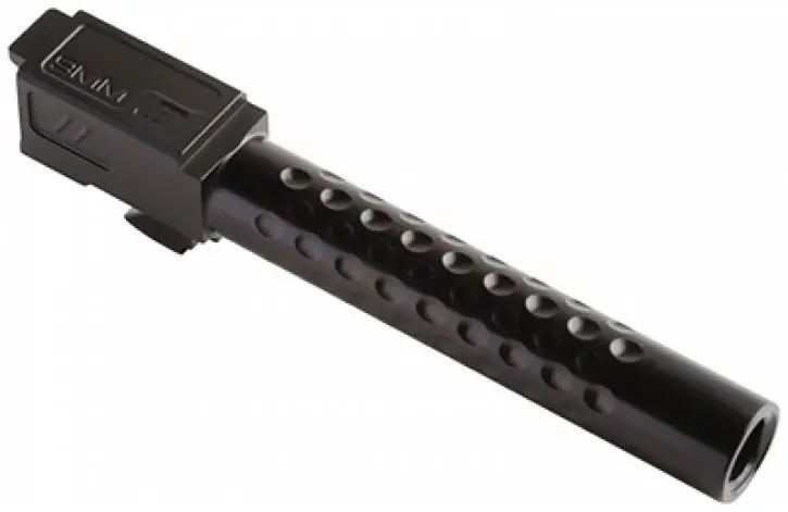 Zev Technologies Match Grade drop-in Glock replacement barrels are manufactured with pre-hardened chromium stainless steel (416R). This material provides high tensile strength and toughness to withstand typical chamber pressures while still being highly corrosion resistant. It comes packaged in a box with foam inserts. This standard model is compatible with Glock 19 Gen1-5 and has a black DLC finish with dimples.