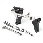 ZEV Technologies Pro Trigger is built from the ground up to perform better and more reliably than anything else on the market. At its core is a proprietary trigger bar and professional connector. This Ultimate model has a flat face riveted trigger and black housing and safety. It is compatible with G19/G17/G34/G26 Gen1-3. Included is a trigger bar, Pro connector, firing pin safety and spring, Pro striker spring, skeletonized striker, trigger spring, and ejector housing.