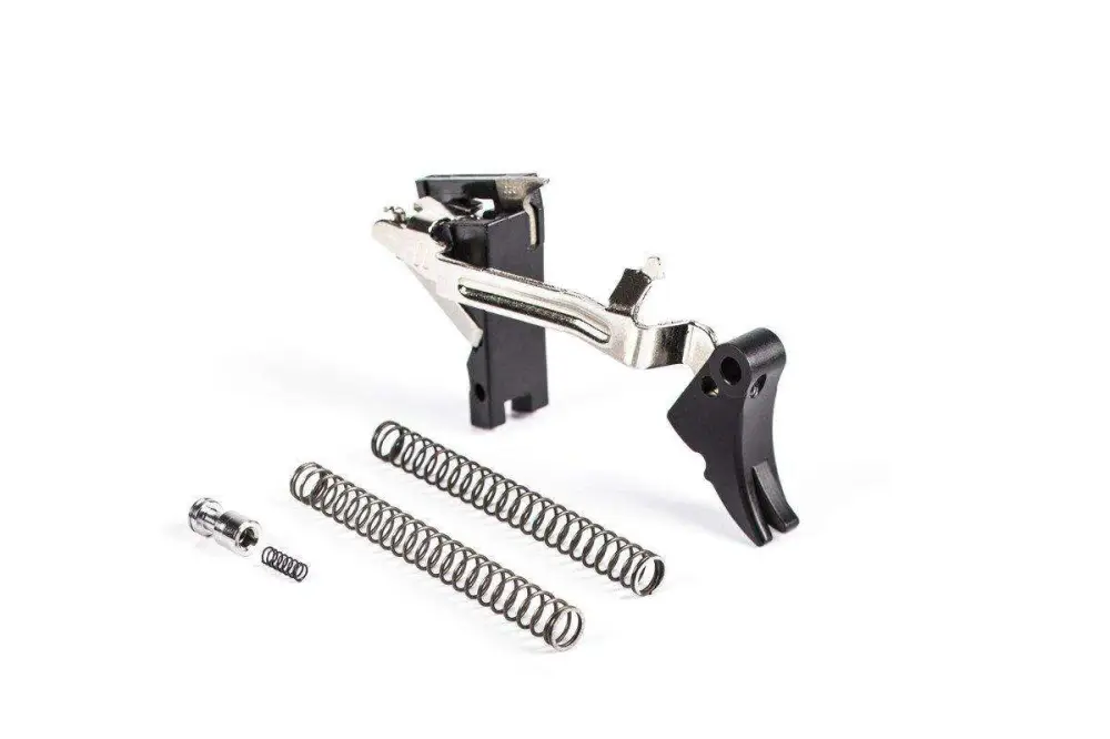 Zev Technologies Adjustable Fulcrum Drop-In Trigger kit is an important upgrade compatible with your Glock. The trigger face is flatter and the trigger safety is three times wider than a stock trigger; which makes it ideal for quickly placing your finger in the optimal firing position. The pre-travel and over-travel are adjustable to allow for a shorter pull, crisper break and faster reset. The Adjustable Fulcrum Trigger Drop-In kit has a polished steel trigger bar, ZEV trigger pad and safety constructed of 6061 T6 aluminum with a hard anodized finish, trigger safety spring, ejector housing, race connector, 2lb and 3lb striker springs, stainless steel firing pin safety, firing pin safety spring, and two adjustment wrenches. This model is compatible with Glock 17/17/L/17C/19/19C/26/34 Gen1-3 and has a black housing/red safety.
