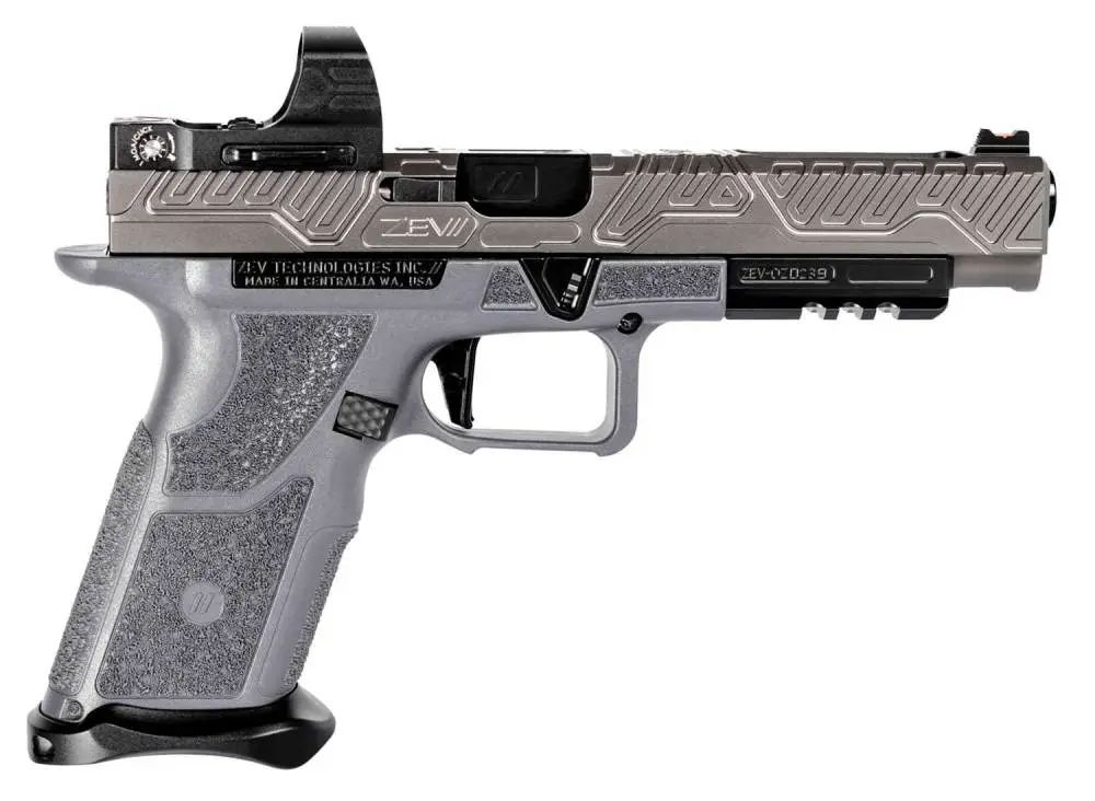 The Competition Model O.Z-9 features an exclusive KC Signature G34 length slide, coated titanium gray and cut for a Bushnell First Strike 2.0 optic. At the heart of the O.Z-9 is Zev's pat. pending steel receiver. This solid steel frame runs the length of the entire pistol allowing the locking block to be fully integrated. The extended rails in the steel receiver help provide more than double the surface area of contact to the slide. Additional benefits include channels that clear out debris while also acting as lubricating reservoirs for high friction areas. The O.Z-9 is compatible with ZEV components and accepts GLOCK mags, and will include future grip sizes, color, and texture options. It also features a ZEV match grade barrel, ZEV PRO flat face trigger, and includes a custom SKB case and 2 Magpul PMAG 17 GL9.