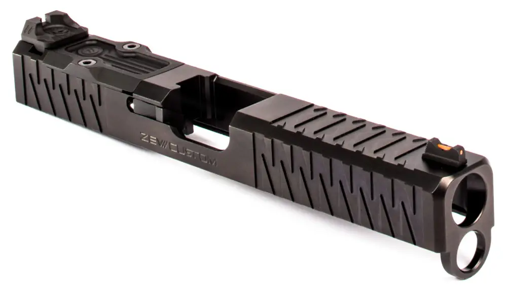 The Enhanced SOCOM Slide Kit is visually stylish and has angled front and rear serrations which offers plenty of grip. The small top serrations help to reduce glare. It is machined from 17-4 billet stainless steel and aluminum. The Enhanced SOCOM Slide Kit includes: stripped ZEV slide, fiber optic front/combat rear sight set, RMR adapter plate, stainless steel firing pin safety, firing pin safety spring, skeletonized striker, striker spring, and an aluminum back plate. This model is compatible with Glock 17 Gen4 and has a black DLC finish.